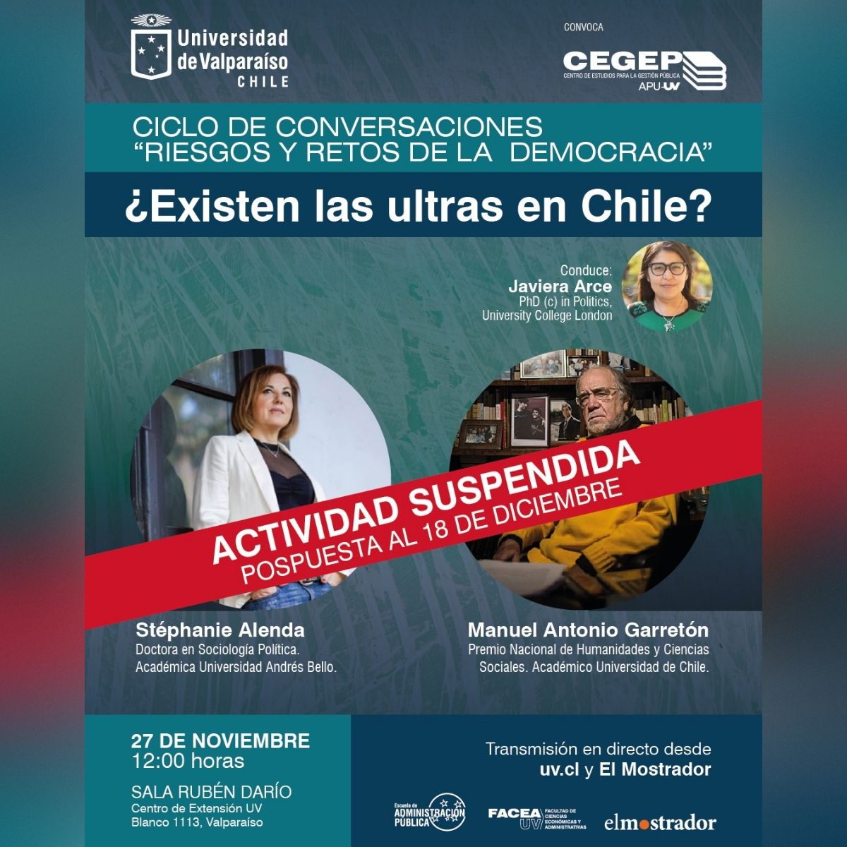 La actividad Ciclo Riesgos y Retos de la Democracia ¿Existen las ultras en Chile? Se suspende por razones de salud de un/a ponente. Se pospone para el 18 de diciembre.